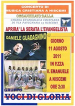 ● 23/24/25 Settembre 2010 dalle ore 20.00 in poi settimana di Evangelizzazione all'aperto a Piazza Dei Martiri - 93015 Niscemi (CL). A cura della Chiesa Cristiana Evangelica locale di via San Martino,10 (Pastore Pino Camagna) - CLICCA QUI PER VOLANTINO